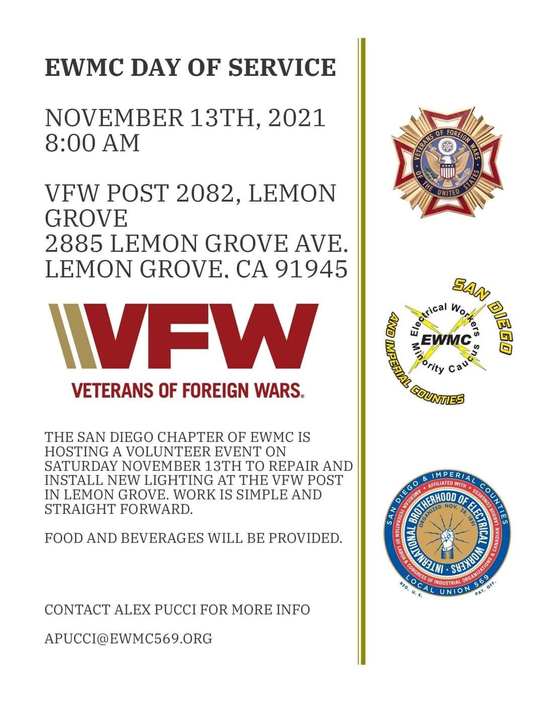 The San Diego Chapter of EWMC is hosting a volunteer event on Saturday, November 13th to repair and install new lighting at the VFW Post in Lemon Grove. Work is simple and straight forward.