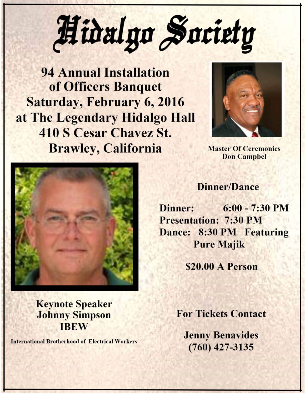Johnny Simpson, IBEW 569 Business Manager, will be the keynote speaker of the 94th Annual Hidalgo Society Installation of Officers Banquet on Saturday, February 6th at the legendary Hidalgo Hall (410 S. Cesar Chavez Street, Brawley, CA).