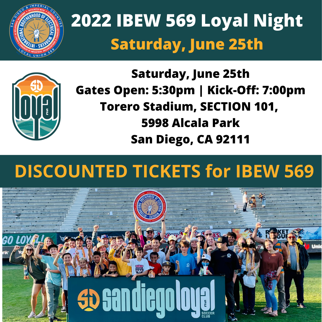 DETAILS: Join hundreds of IBEW 569 members, supporters, and families to cheer on the San Diego Loyal Soccer Club in Section 101 at Torero Stadium on Saturday, June 25th.
