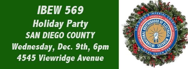 The International Brotherhood of Electrical Workers (IBEW) Local 569 is getting ready to celebrate the holidays! Bring your family to our annual Holiday Party on Wednesday, December 9 between 6:00-8:30pm!