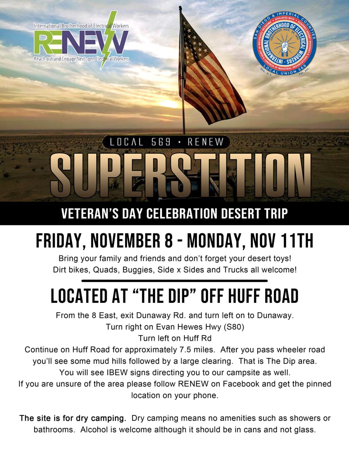 IBEW 569 Members – please join RENEW 569 for their Veteran’s Day Trip To Superstition.