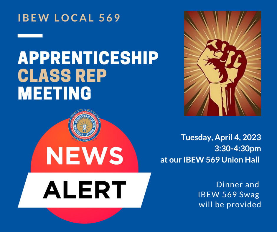 To make sure all apprentice concerns are easily addressed and answered we are going to start a new monthly Class Rep meeting at the Union Hall. Meetings will be held the first Tuesday of each month from 3:30-4:30. Our second meeting will be April 4th. Dinner and IBEW 569 swag will be provided. Work picture, contract clarification or just time for questions and answers will all be discussed.