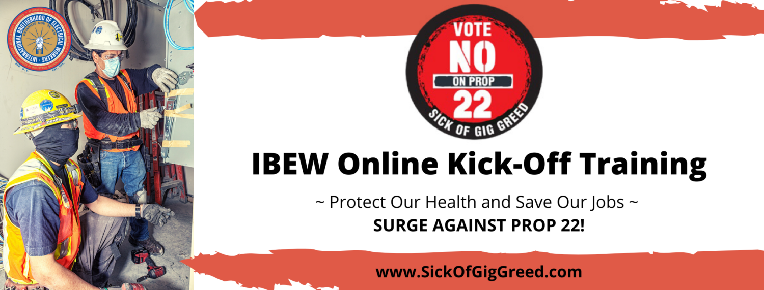 September 3, 2020February 9, 2024IBEW 569 Members, Take Action IBEW 'No on Prop 22' Online Campaign Training IBEW 569 Members – please join our IBEW ‘No on Prop 22’ Online Campaign Training on Tuesday, September 15th from 5:00-6:00pm – […]