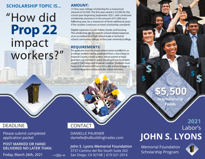 The John Lyons Memorial Foundation 2021 Scholarship Program is open for applications! Labor’s John S. Lyons Memorial Foundation Scholarship Program Contact: Danielle Paukner danielle@sdbuildingtrades.com John […]