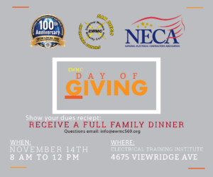 This Saturday, November 14th, in conjunction with the #EWMC National Day of Giving, IBEW 569, NECA San Diego, and EWMC will be hosting