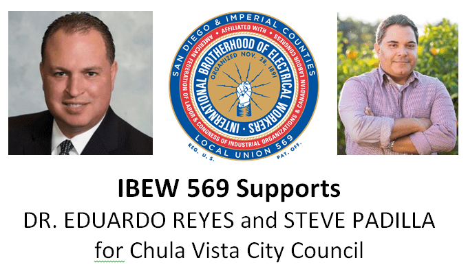 Join your IBEW 569 brothers and sisters to support Eduardo Reyes and Steve Padilla for Chula Vista City Council – this is a high priority campaign and we need VICTORY in this election! Bring your family and co-workers!