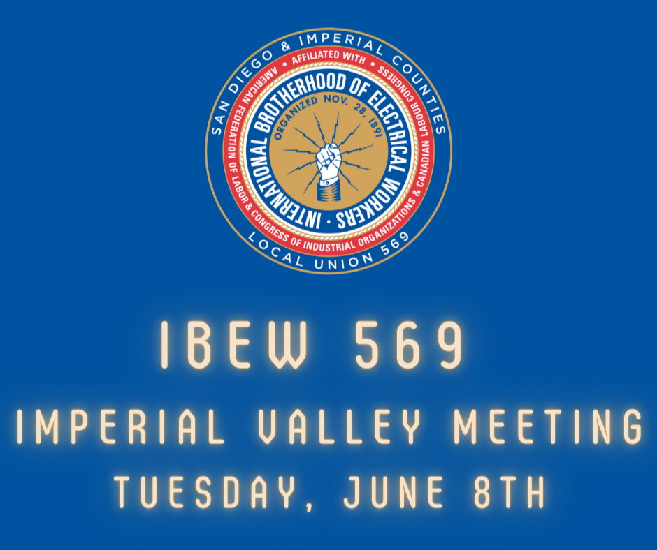 IBEW 569 Members in Imperial County / Imperial Valley – please join us to get engaged with our Union and learn of important updates and business developments, including a contract update. Weather permitting, we will hold our IV Meeting outdoors in our IBEW 569 parking lot with COVID compliant guidelines and social distancing. Face masks required.
