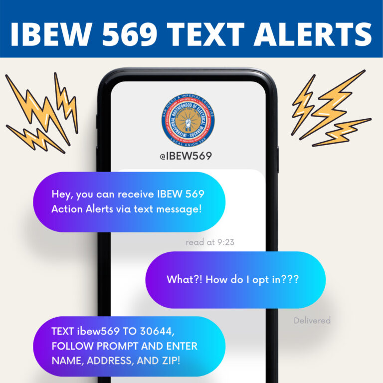 To receive IBEW 569 TEXTS and ACTION ALERTS, text “ibew569” to 30644, then follow the prompt to enter your name, address and zip. You can opt out any time by texting STOP to 30644.