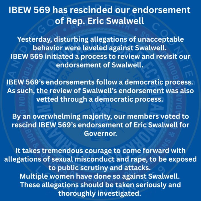 April 11, 2026April 11, 2026News, Press Release IBEW 569 Rescinds Endorsement for Eric Swalwell for Governor IBEW 569 Rescinds Endorsement of Rep. Eric Swalwell San Diego, CA – On April 10, 2026, disturbing allegations of unacceptable behavior were […]